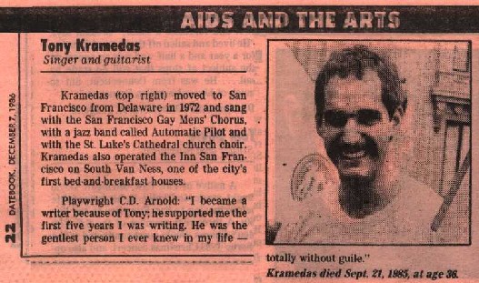 Automatic Pilot membersTony Kramedas Tony Kramedas joined Automatic Pilot in 1980 shortly after its inception, appearing in the first public performance. His enthusiasm was the driving force behind the band's activities. In addition to Automatic Pilot, Tony sang with the Gay Men's Chorus and the St.Lukes Cathedral choir. He was the co-proprietor of The Inn San Francisco, and worked to restore and transform the Victorian on South Van Ness into one of the city's premiere bed and breakfast establishments. Tony was also well known for his garage sales. From the beginning, Tony saw great potential in the band's songs, and persevered to make it happen. He financed numerous demo recordings of the band, each one an improvement on the one before. After Automatic Pilot's live performing days came to an end, Tony produced and financed a number of professional recordings of the band's songs, featuring the voices of Matt and Tony, backed by Karl's keyboards and some of the best studio musicians the Bay Area had to offer. The resulting compilation, posthumously titled "Back from the Dead" is Tony's baby. Tony died on Saturday September 21, 1985. His contribution was recognized in a cover article for the SF Chronicle Datebook titled: AIDS: A Staggering Blow to Bay Area Arts.